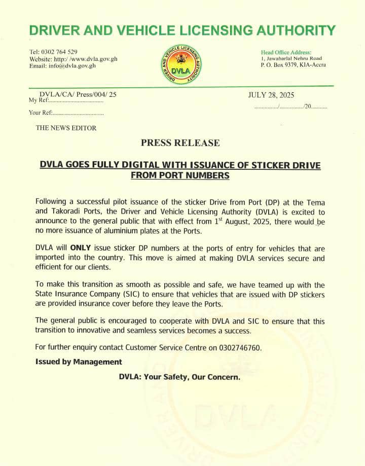 The Driver and Vehicle Licensing Authority (DVLA) says starting August 1, 2025, it will no longer issue aluminium ‘Drive from Port’ (DP) number plates at the country’s ports.