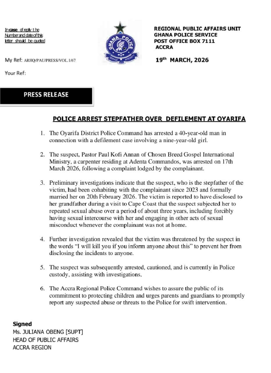 According to a press release issued by the Accra Regional Public Affairs Unit on March 19, 2026, the suspect, Pastor Paul Kofi Annan, was picked up by the Oyarifa District Police Command following a complaint lodged by the victim’s family.