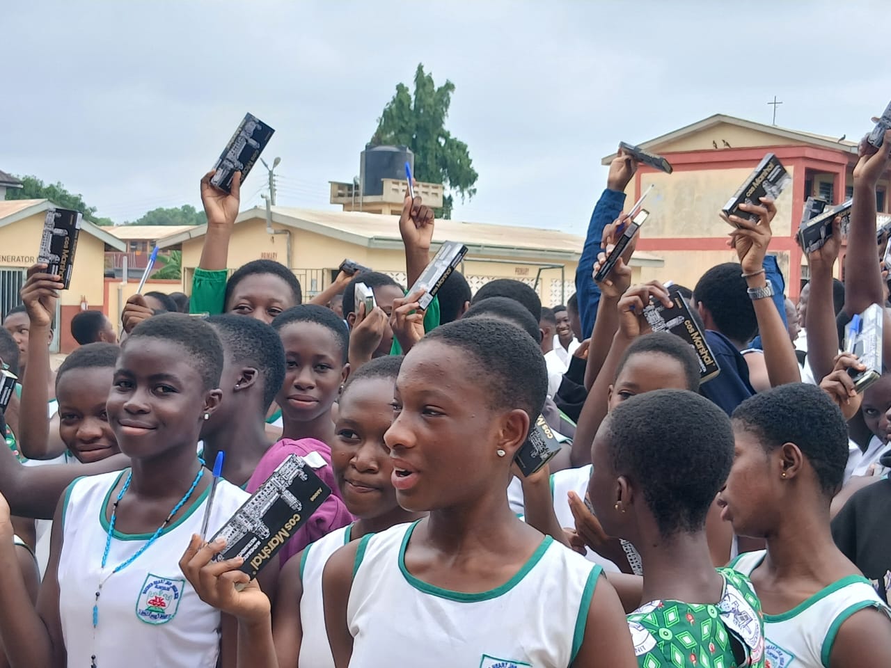 The items comprise quantities of mathematical sets and boxes of pens to be distributed among 260 candidates selected from the Sacred Heart Junior High School (JHS), His Grace Academy and Resurrection Preby JHS and Panest JHS.