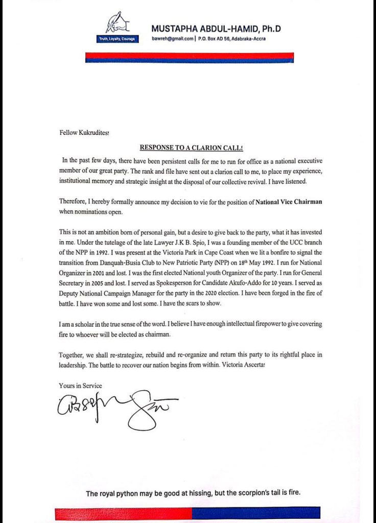 In a press statement to party faithful, Dr. Abdul-Hamid said his decision follows persistent calls from the rank and file of the party urging him to bring his experience and institutional knowledge to bear in rebuilding the NPP.