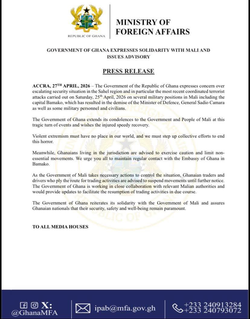 The Government of Ghana has expressed deep concern over the escalating security situation in the Sahel region following coordinated terrorist attacks on Saturday, April 25, on several military positions in Mali, including the capital Bamako, which resulted in the death of Mali's Minister of Defence, General Sadio Camara, as well as other military personnel and civilians.