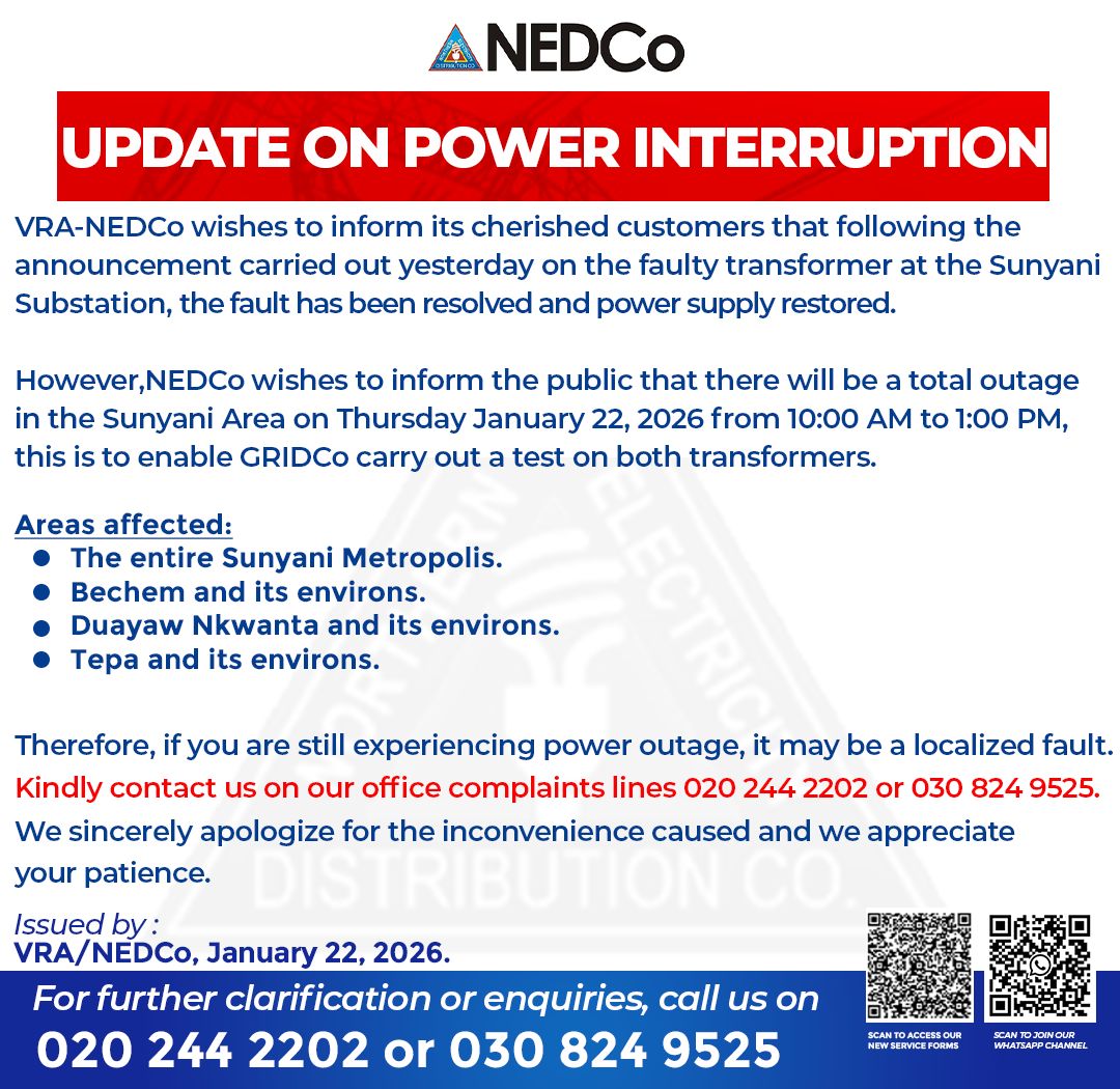 The Northern Electricity Distribution Company (NEDCo) has announced the restoration of power supply to affected communities in Sunyani following the repair of a faulty transformer that disrupted electricity distribution in recent days.
