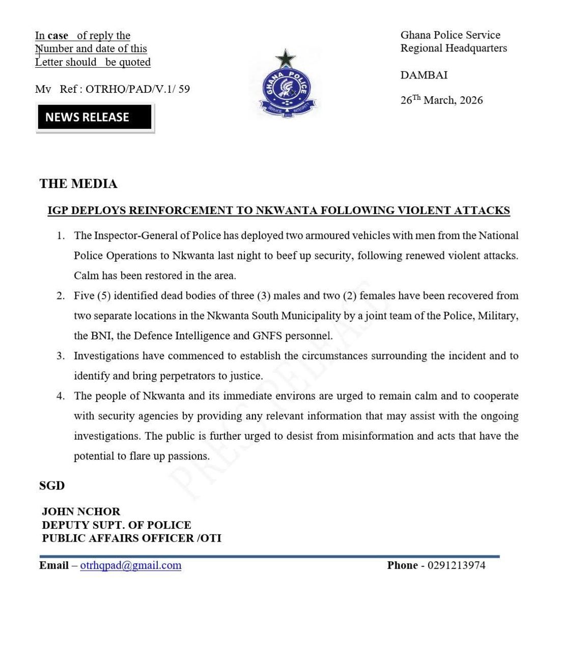 The statement was signed by John Nchor, Deputy Superintendent of Police and Public Affairs Officer for the Oti Region.