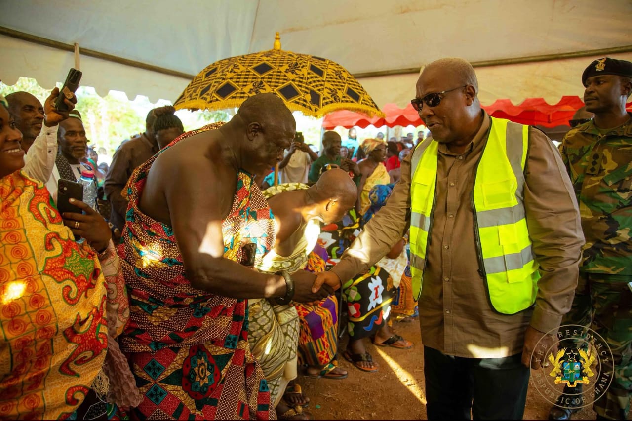 During the inspection, President Mahama met with traditional authorities, including chiefs, queen mothers, community leaders, and local residents to assess progress on the road project and hear firsthand the impact on communities.